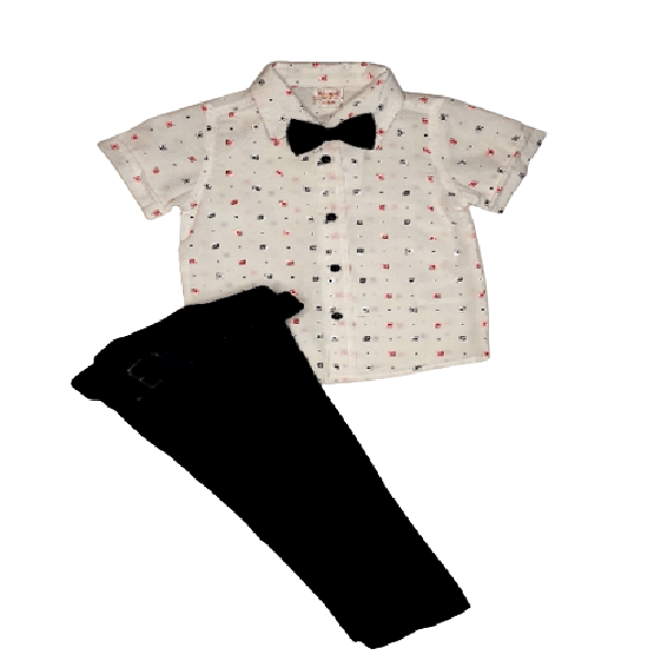 Παιδικό σετ για αγόρι, λευκό πουκάμισο με μοτίβα, μπλε μακρύ παντελόνι, μπλε ζώνη και παπιγιόν.